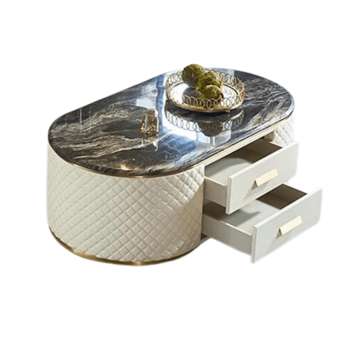 - Oval marble top coffee tables: Oval marble top coffee tables offer a best-of-both-worlds solution, with the versatility of a rectangular marble top coffee table and the softness of a round marble top coffee table.