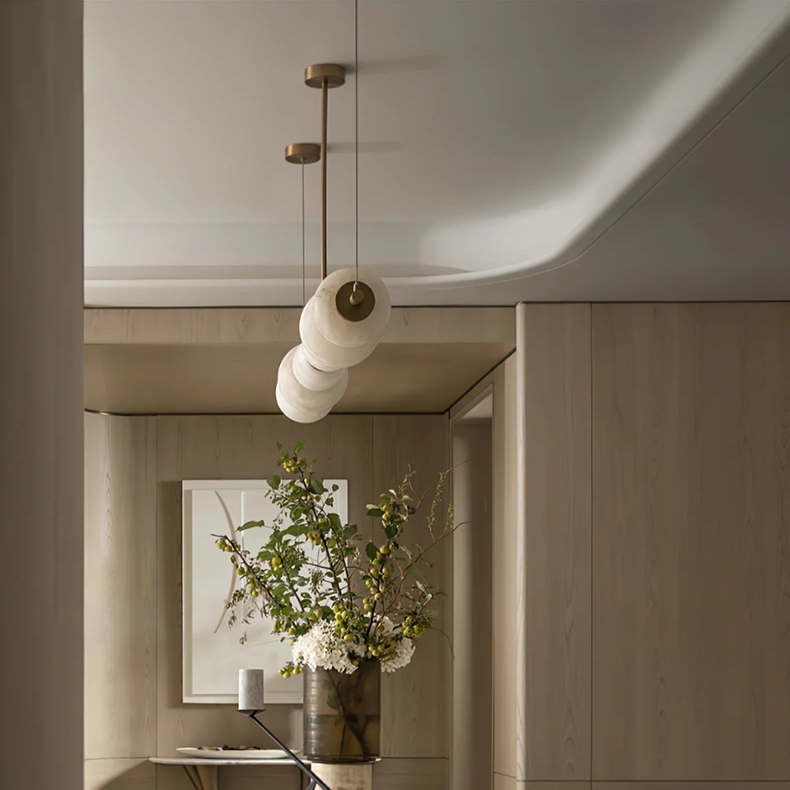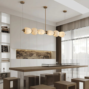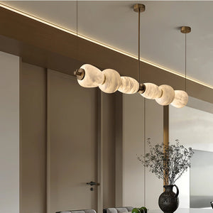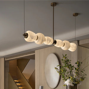 Bring natural elegance into your space with the Alabaster Pebble Linear Chandelier by Vakkerlight. Each hand-carved alabaster shade resembles a smooth river stone, emitting soft, warm light that enhances the ambiance of any room.