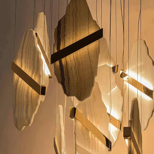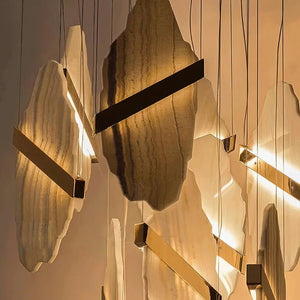 Elevate your interiors with the Auralith Chandelier by Vakkerlight, a breathtaking fusion of natural artistry and modern design. Its asymmetrically cut, stone-like alabaster panels appear to float in mid-air, transforming raw geological textures into a refined sculptural centerpiece. Each slab conceals an integrated LED strip that radiates a warm, diffused glow—creating an immersive atmosphere of sophistication and serenity.