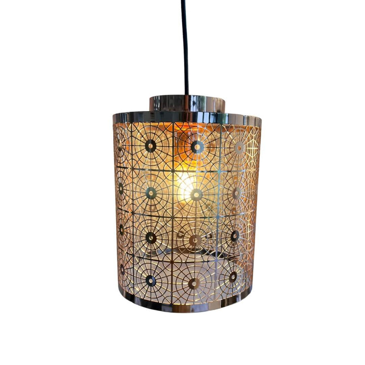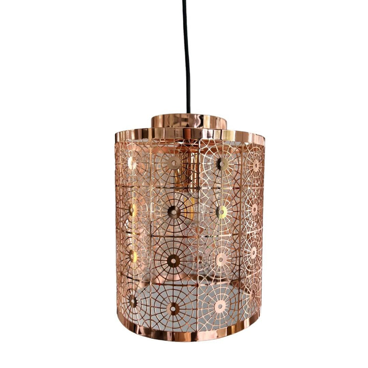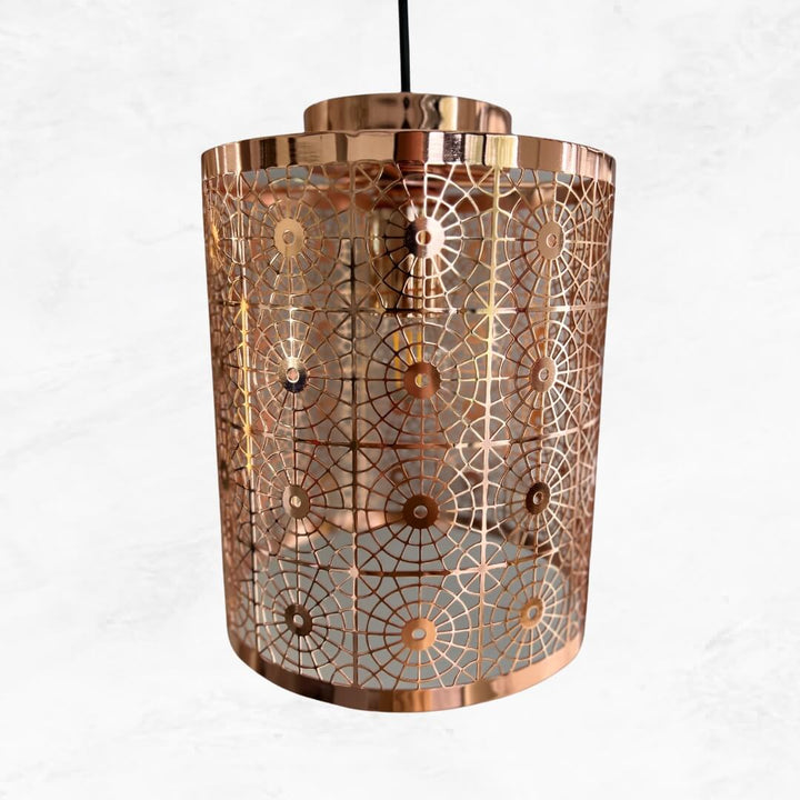 Illuminate your space with the exquisite Bocal Geometric Pendant Light, a perfect blend of modern elegance and timeless design. This stunning piece features a cylindrical frame crafted from high-quality copper, adorned with an intricate geometric pattern that casts captivating shadows when lit. The delicate yet sturdy construction ensures both durability and a refined aesthetic, making it an ideal addition to any room.