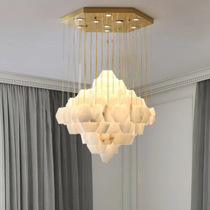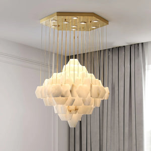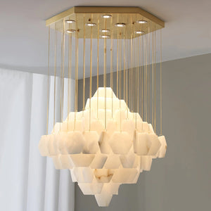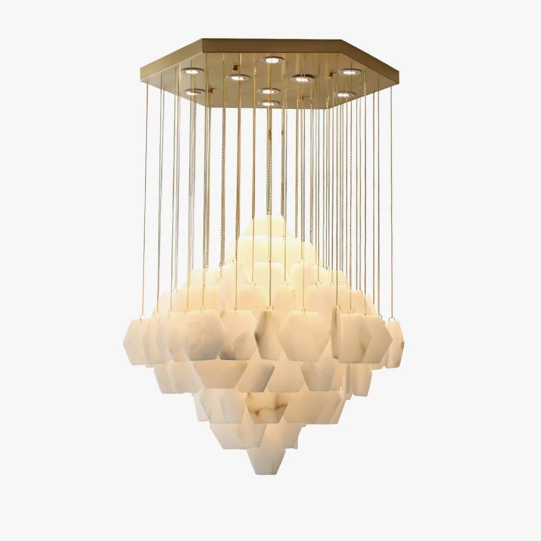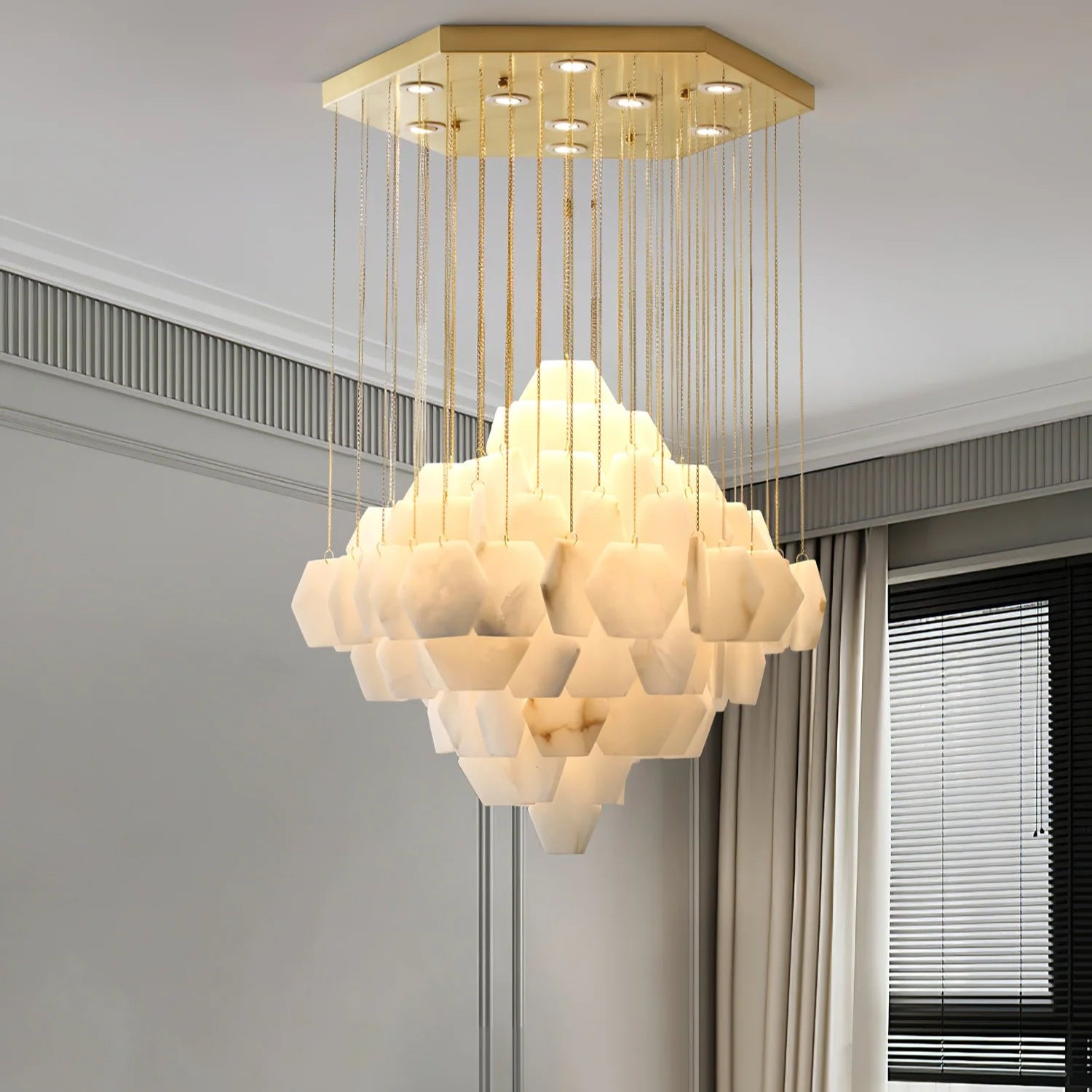 Elevate your interiors with the Hexa Alabaster Cascade Chandelier, where modern design meets luxurious craftsmanship. Featuring hexagonal alabaster pieces suspended from a sleek gold frame, this chandelier delivers a soft, ambient glow that transforms any space into an elegant sanctuary.