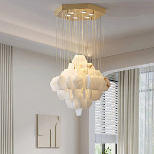Ideal for dining rooms, grand entryways, or living areas, the cascading design creates a visually stunning centerpiece. Each alabaster piece diffuses light beautifully, casting warmth while reflecting a sophisticated, contemporary aesthetic. With integrated energy-efficient LED lighting, it combines style and functionality, making it both a luminous fixture and a work of art.