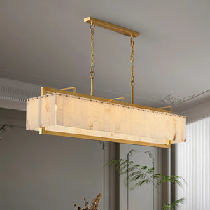 The Solstice Bar Chandelier is a striking blend of geometric precision and natural elegance. Featuring a refined brass framework adorned with vertically aligned alabaster tiles, it radiates warmth reminiscent of a sunset horizon. The rectangular silhouette emphasizes symmetry, while the natural veining of the alabaster adds subtle, organic nuance.